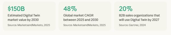 According to Gartner, by 2027 20% of B2B organizations will deploy digital twins to improve revenue generation and customer experience — simulating, anticipating, and personalizing every market interaction. We are still at the beginning of this transition. Those who move now aren't chasing the trend: they're defining it.