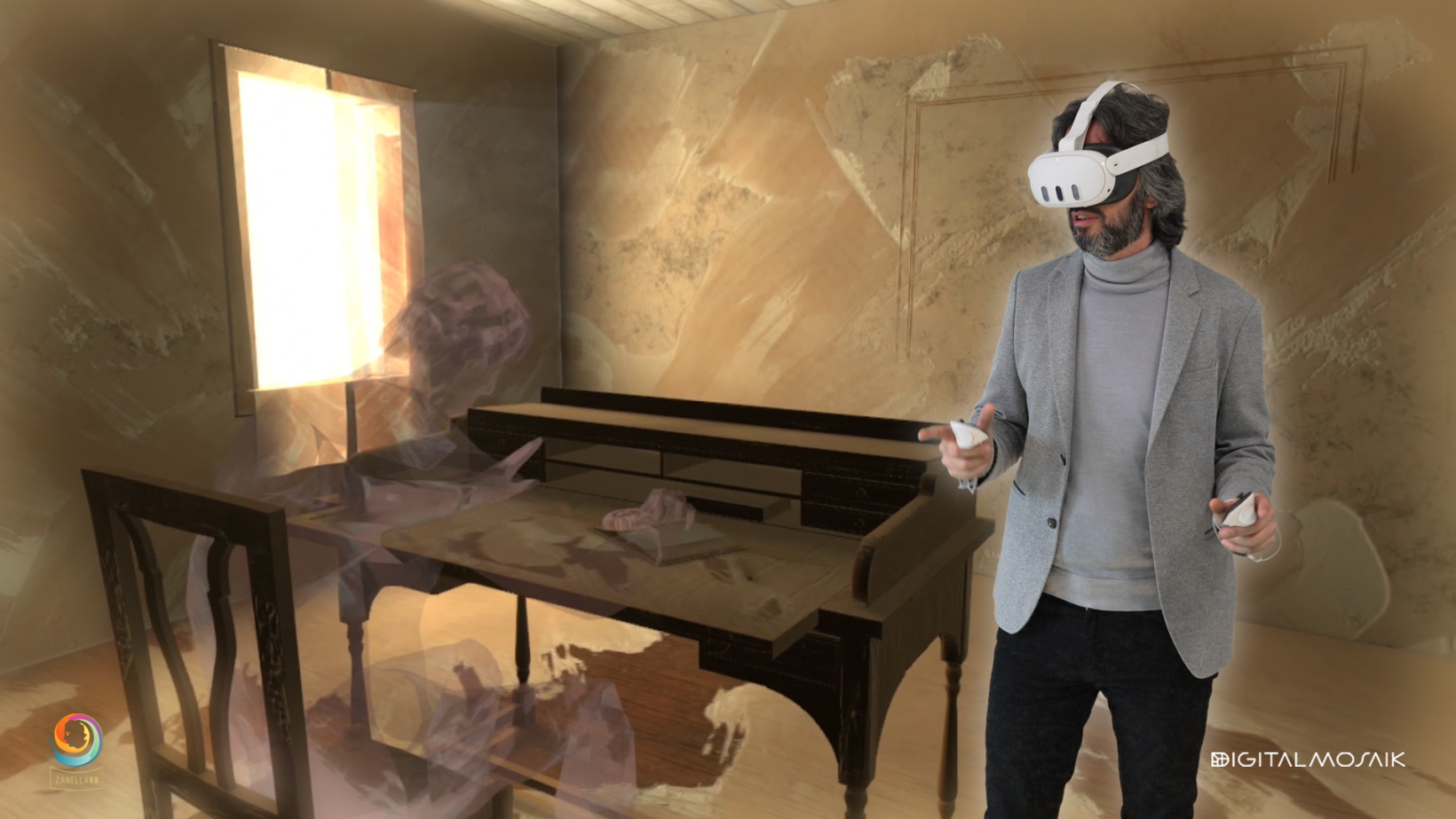 Wearing the headset, the user is transported inside Giacomo Zanella's birthplace in Chiampo, where, accompanied by the poet's theatrical voice, they will experience a journey of discovery of his poetry and the places that inspired him. From initial restlessness to a lyrical joy full of colour, the experience recounts Zanella's metamorphosis through emotions and images that bring his poetry to life.