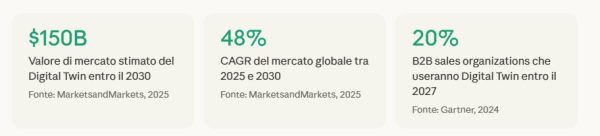 Secondo Gartner, entro il 2027 il 20% delle organizzazioni B2B impiegherà gemelli digitali per migliorare la generazione di revenue e l'esperienza del cliente — con l'obiettivo di simulare, anticipare e personalizzare ogni interazione con il mercato. Siamo ancora agli inizi di questa transizione. Chi si muove adesso non insegue il trend: lo definisce.