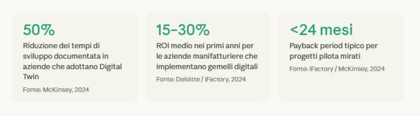 La ricerca di McKinsey documenta che i gemelli digitali possono tagliare i tempi di sviluppo fino al 50%, migliorare l'evasione degli ordini del 20% e ridurre i costi del lavoro del 10%. Questi numeri, se resi visibili e verificabili durante una trattativa commerciale, cambiano radicalmente la natura del colloquio di vendita.