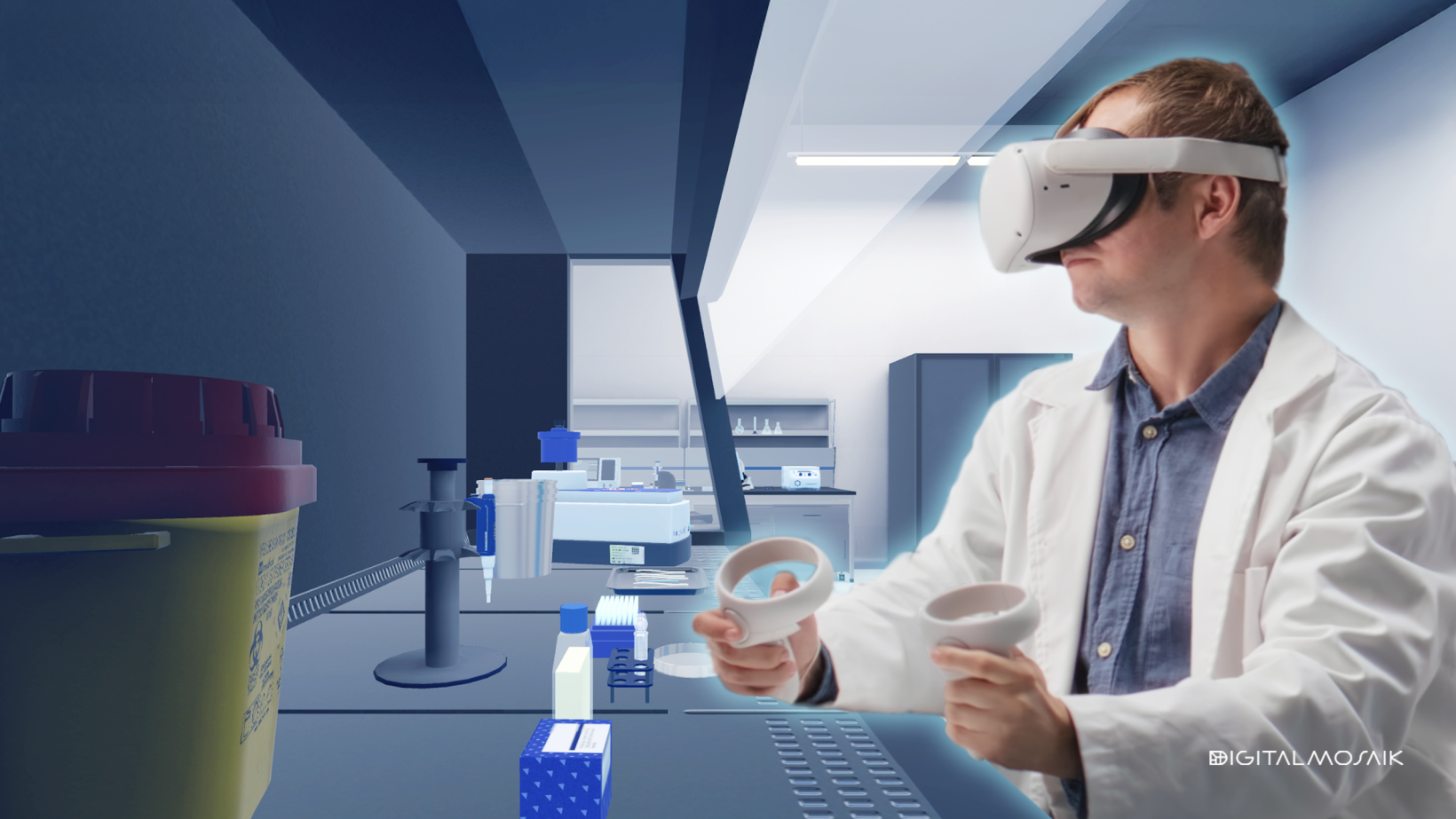 Un simulatore VR che riproduce un laboratorio biologico, permettendo formazione guidata (Training) e valutazione oggettiva (Test) delle competenze del personale tramite piattaforma web LMS.